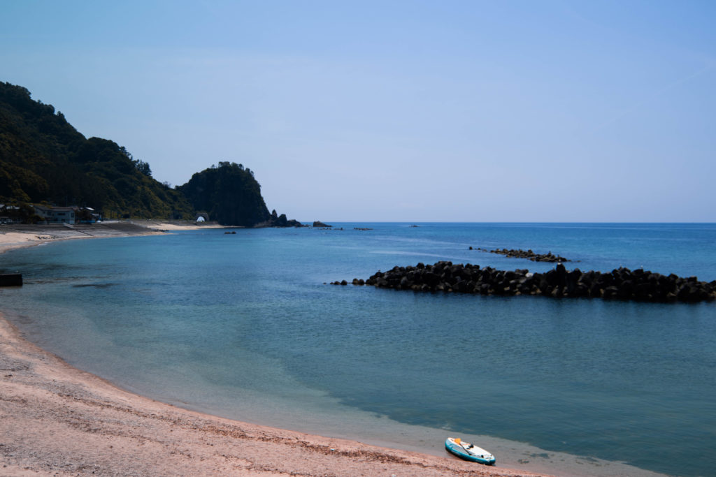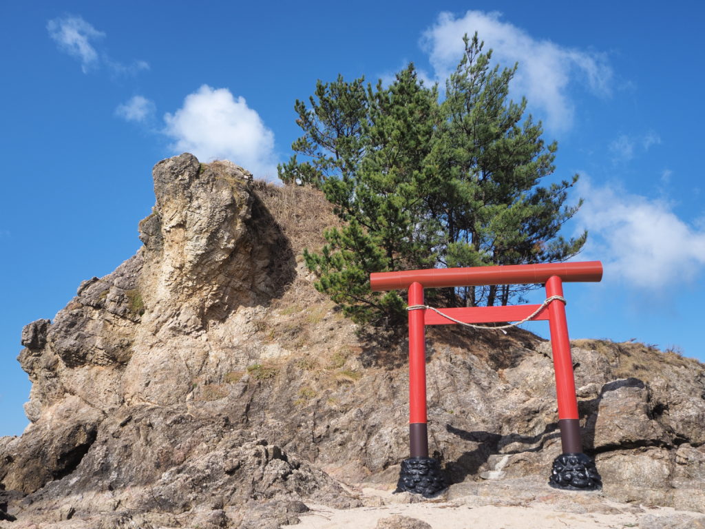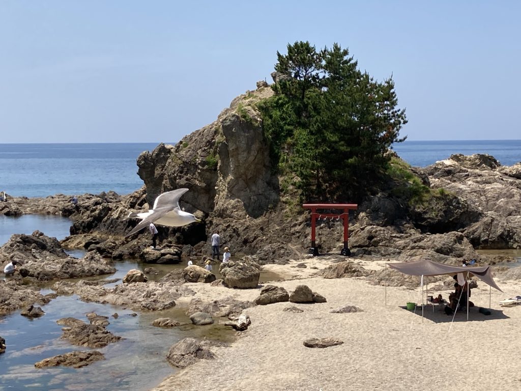 そして海の方に向かうと、すぐに弁天島の姿が目に飛び込んできます。階段を降りまるでトンボロで出現したかのような日本海のエンジェルロードを歩き、弁天島へ向かいます。