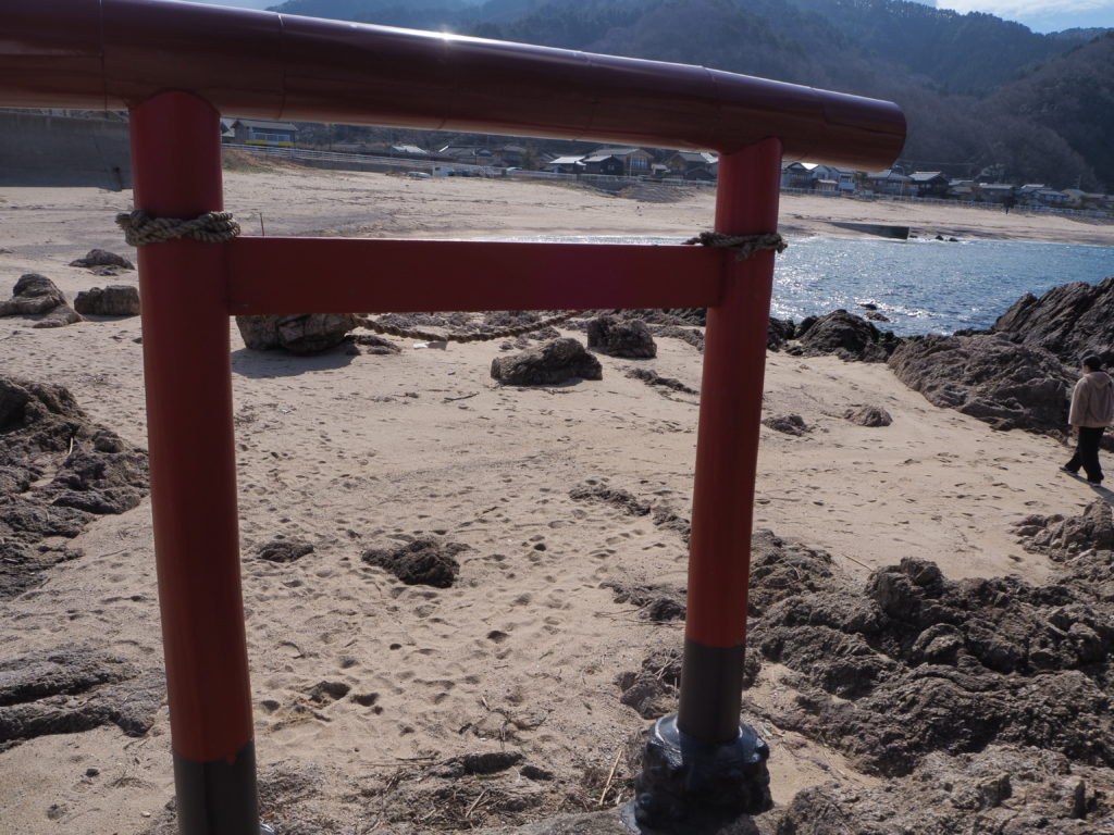 浜に降りるとエンジェルロードのような砂浜の先に鳥居があります。
