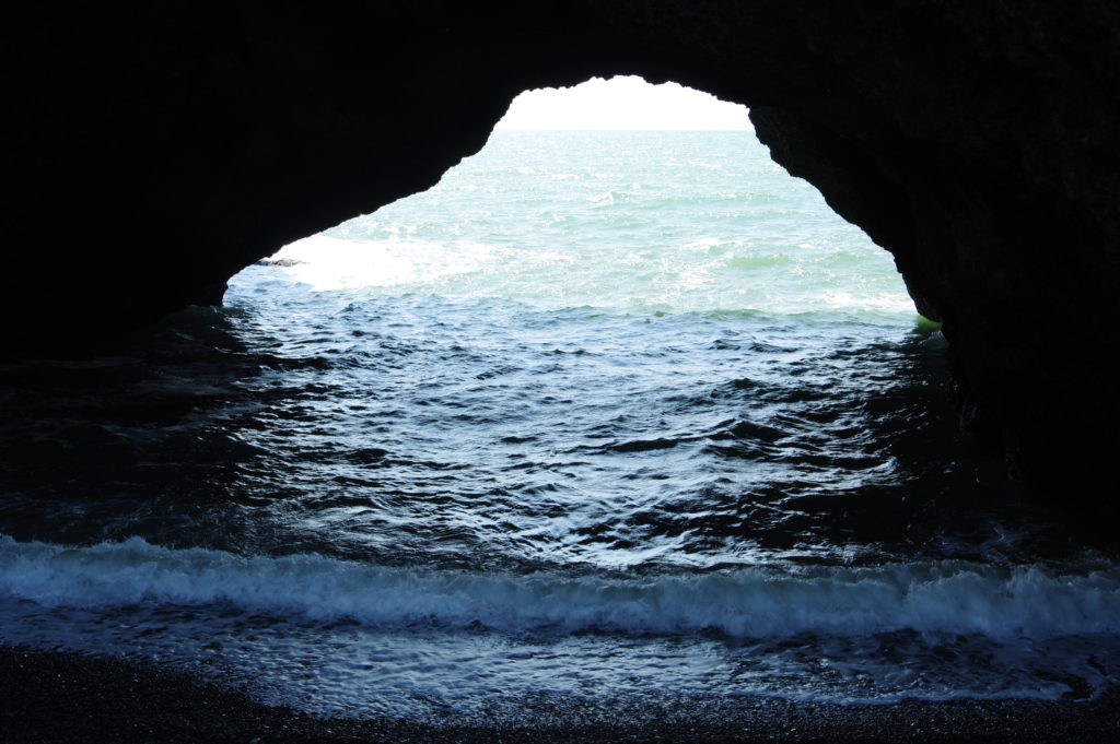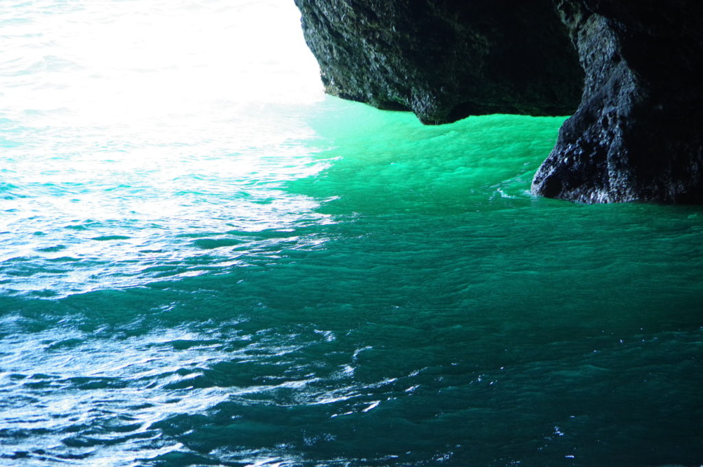 岩場にぽっかりと空いた岩穴が幻想的な雰囲気を醸し出し神秘的。波が洞窟の向こう側から押しては返します。岩穴近くの海水は緑色に染まり、謎めいています。