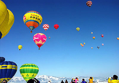 日本海カップクロスカントリー選手権も開催、熱気球の珍しい競技も見られます。雪景色の中カラフルな熱気球と夜の幻想的な光景が楽しめる新潟冬の風物詩です。