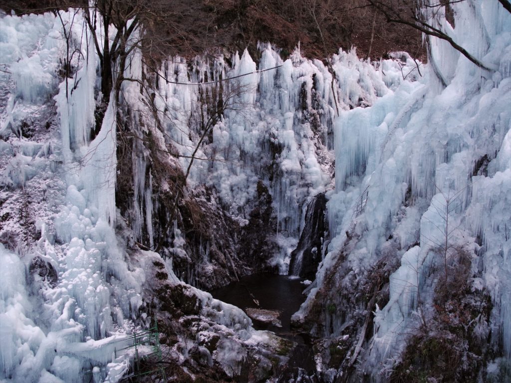 冬になると地元の方々が上流から500mも水をひき壮大なスケールの氷柱を作り出してくれます。渓谷全体に氷柱がひしめき、壮大なスケールの景色を織りなすんですよ。百景は冷たい氷の「ひゃっけー」が掛けられています。