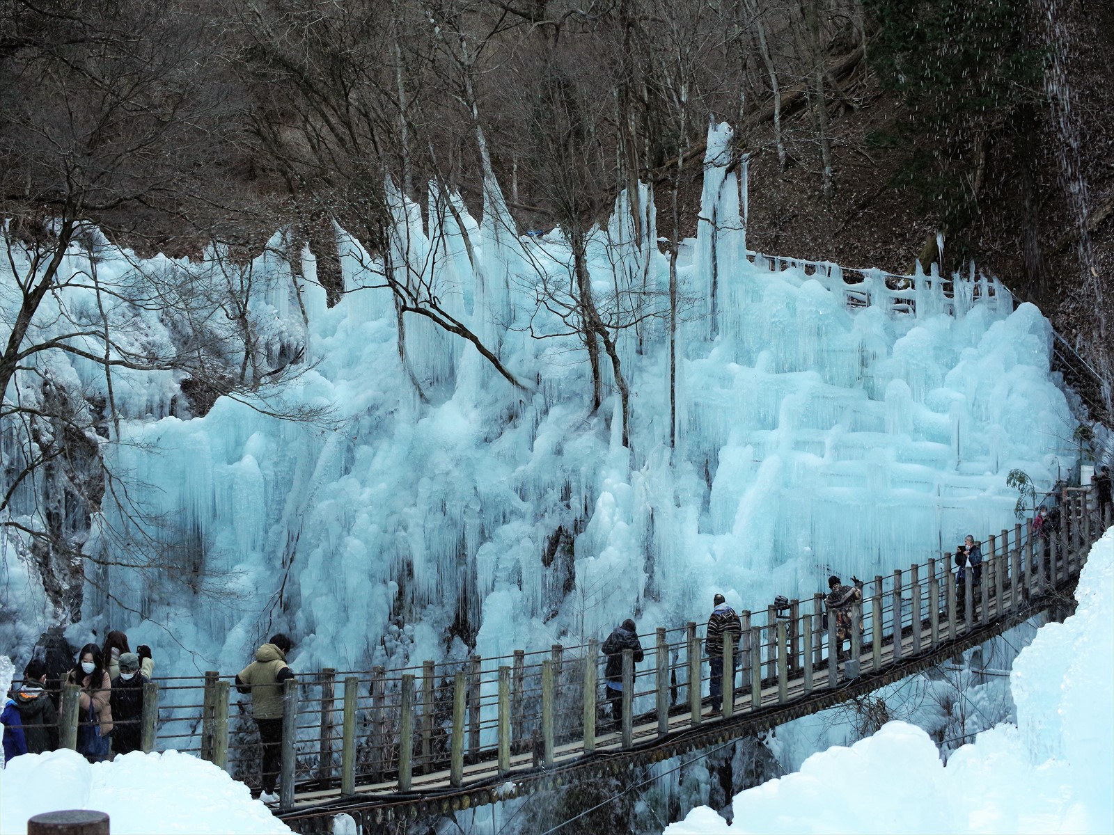 吊り橋から見た上流の氷柱。