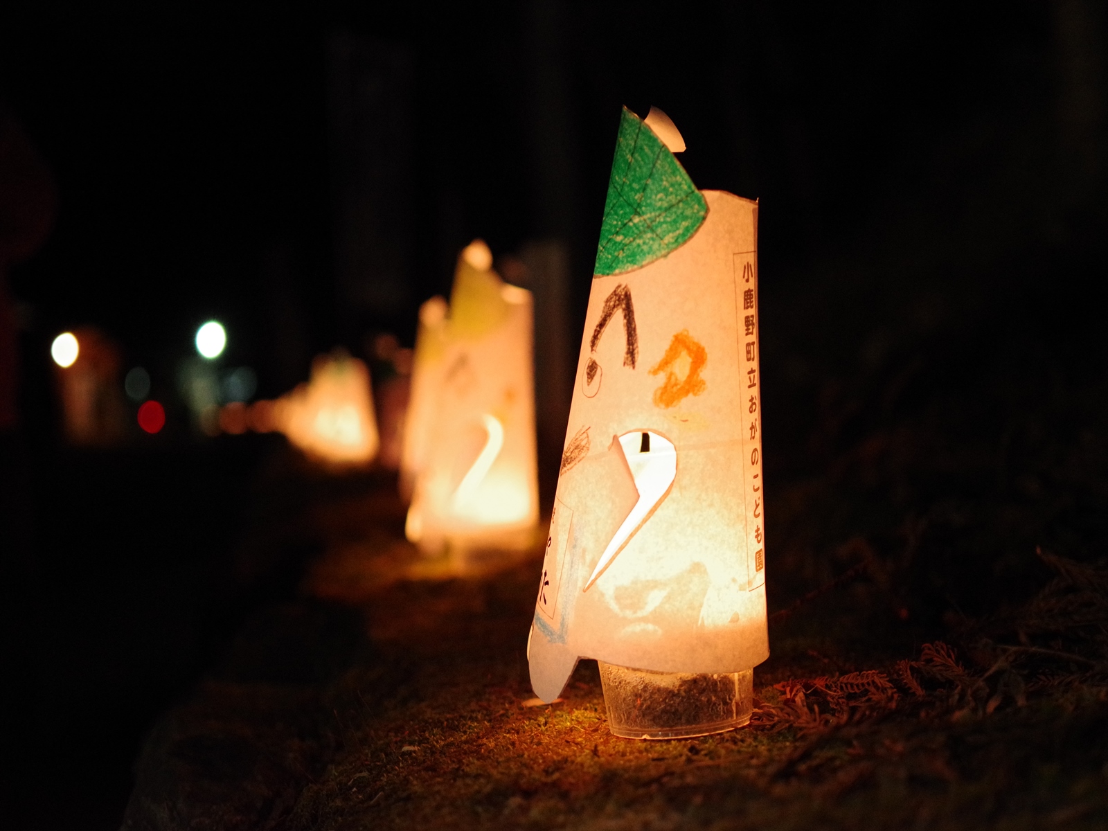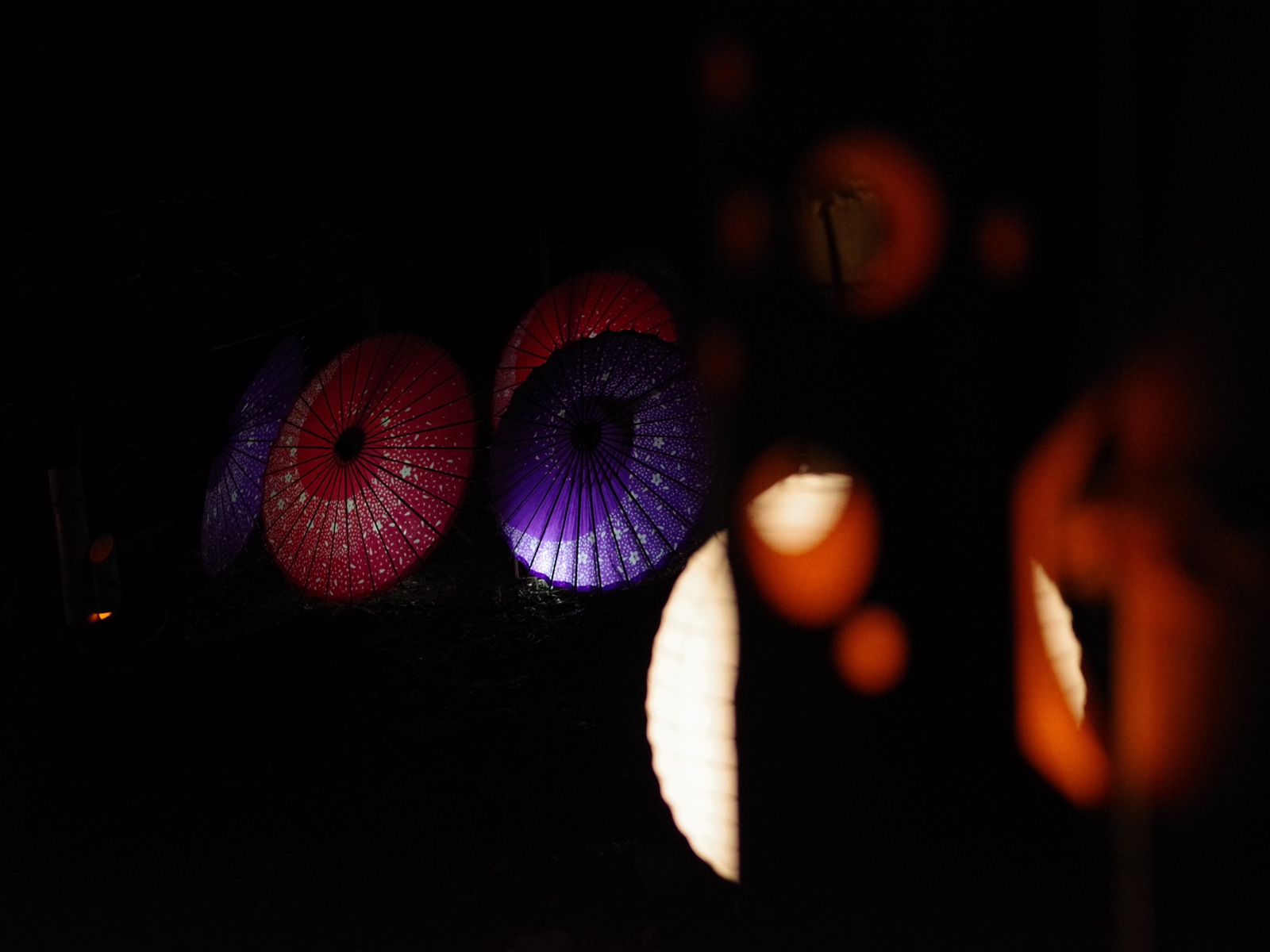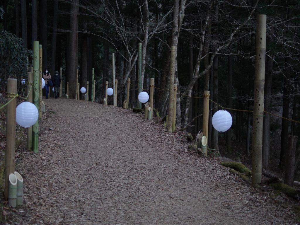 帰り道の遊歩道には傘や竹灯籠、紙で作られた灯籠が飾られていて、風情が溢れます。