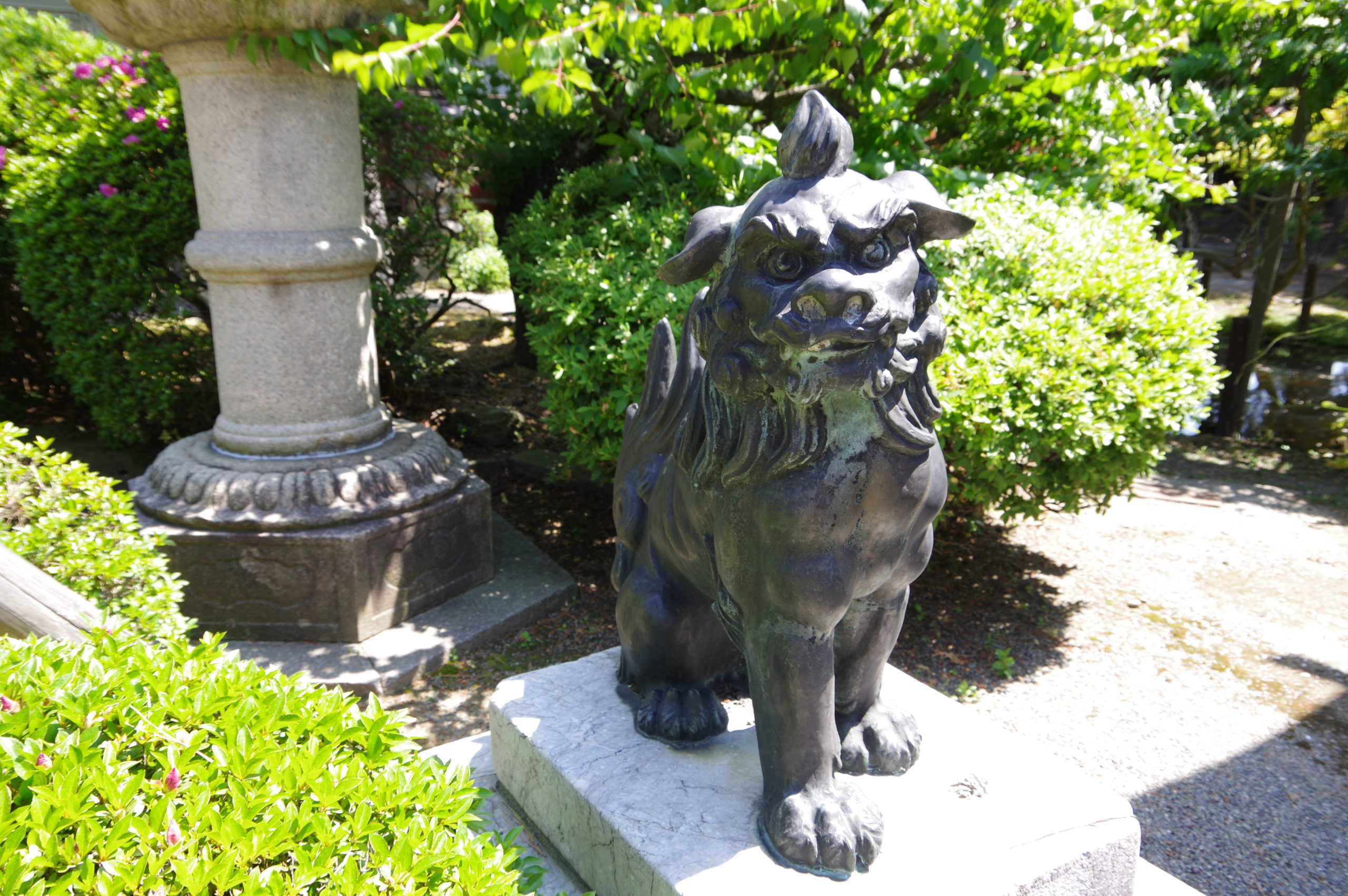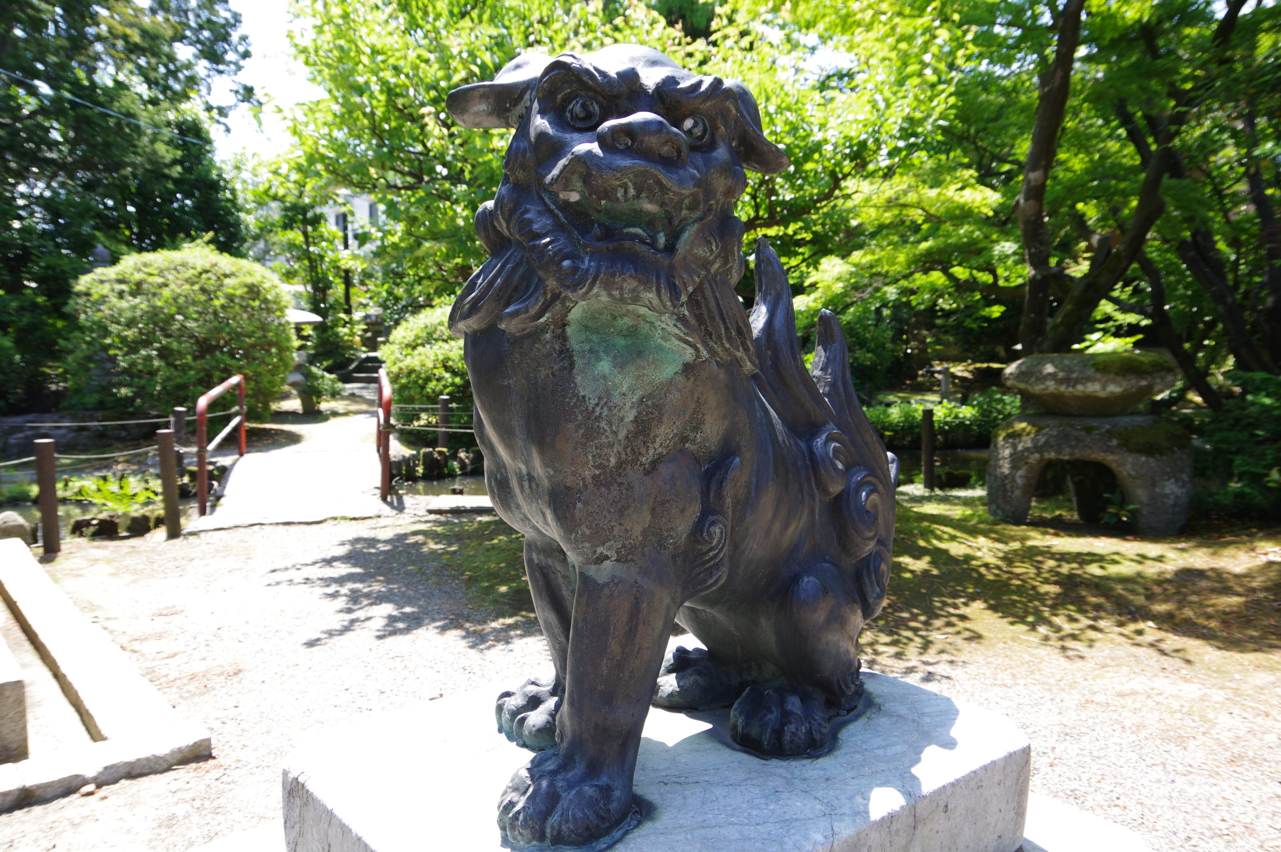 近くには天満宮の代表的な存在牛の像が静かに佇みます。境内には水と緑が溢れる閑静で神々しいパワースポットです。