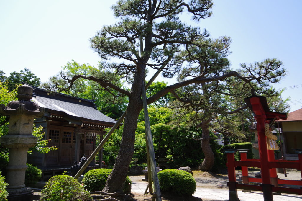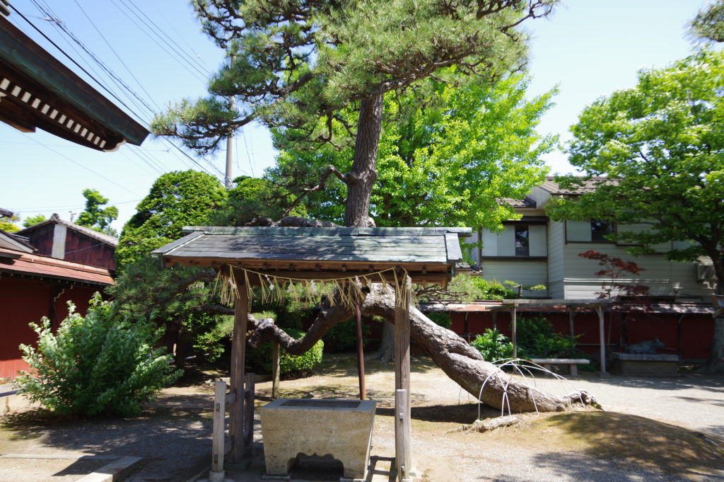 民家の間を抜ける参道を歩き鳥居をくぐると左手には手水舎、その隣に御神木のような立派な松の木があります。