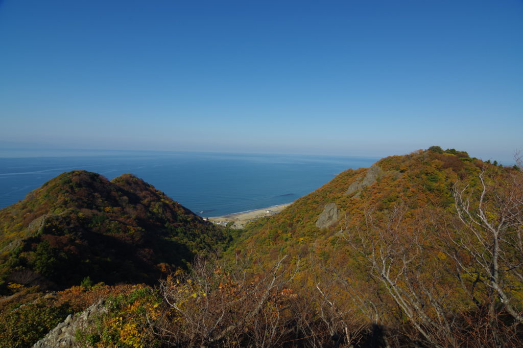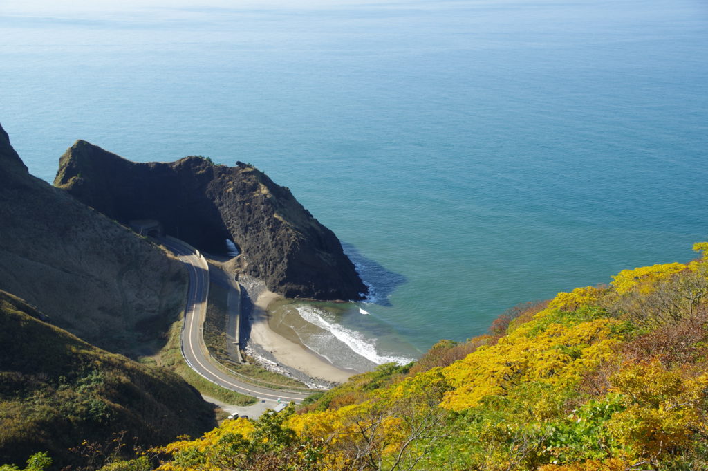 越後七浦シーサイドラインと雷岩も見えます。