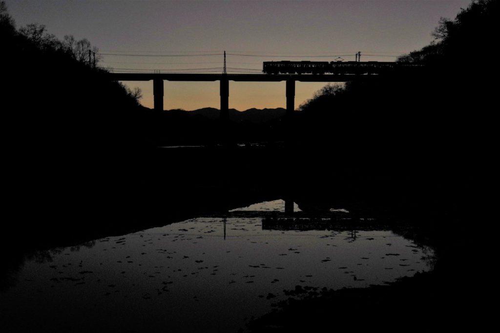 訪れたのは12月初旬の16:00前。すでに日が傾き始めていました。徐々に鉄橋の向こう側に沈みゆく夕日が美しい光を放っています。徐々に日が暮れていき、列車がまるで影絵のように夕空に照らし出され、萌えな鉄道撮影を楽しむことができました。