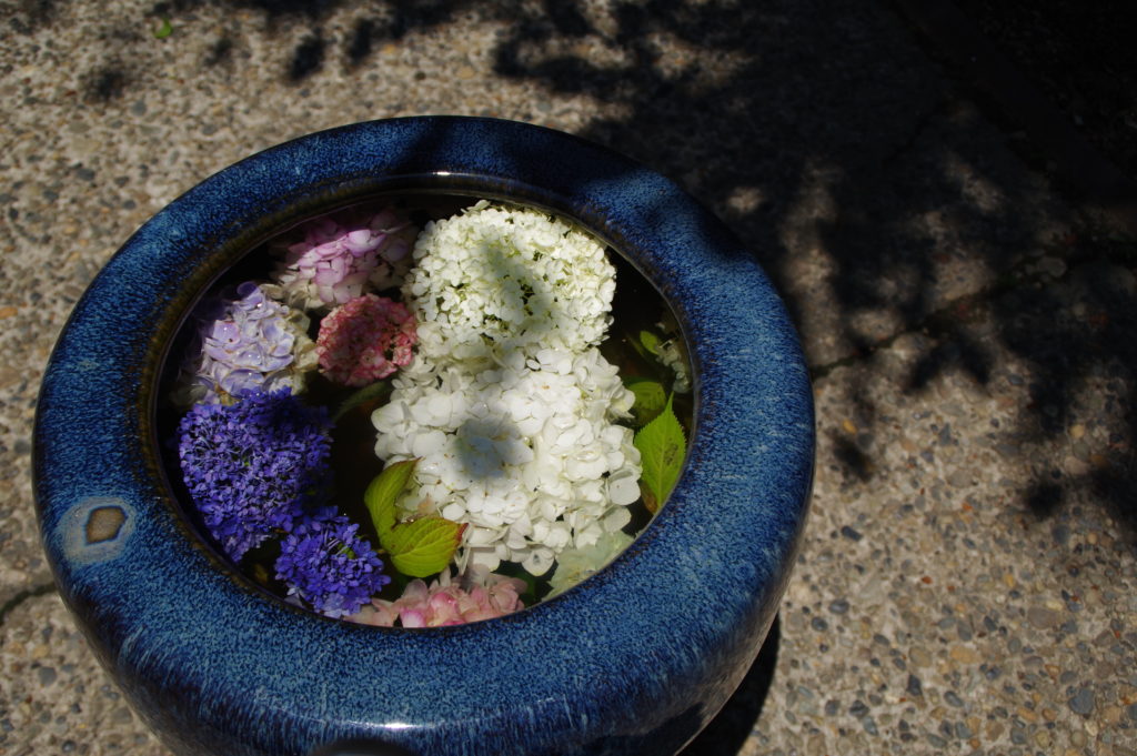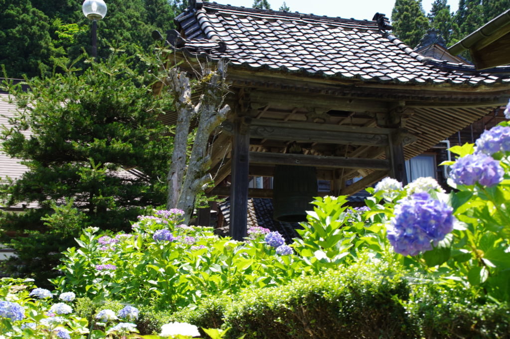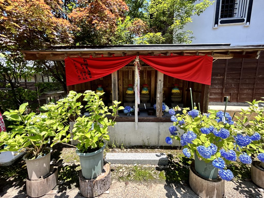 右手に鐘楼、左手にお地蔵様が安置され風情が溢れます。石造りの手水構には紫陽花が手向けられています。