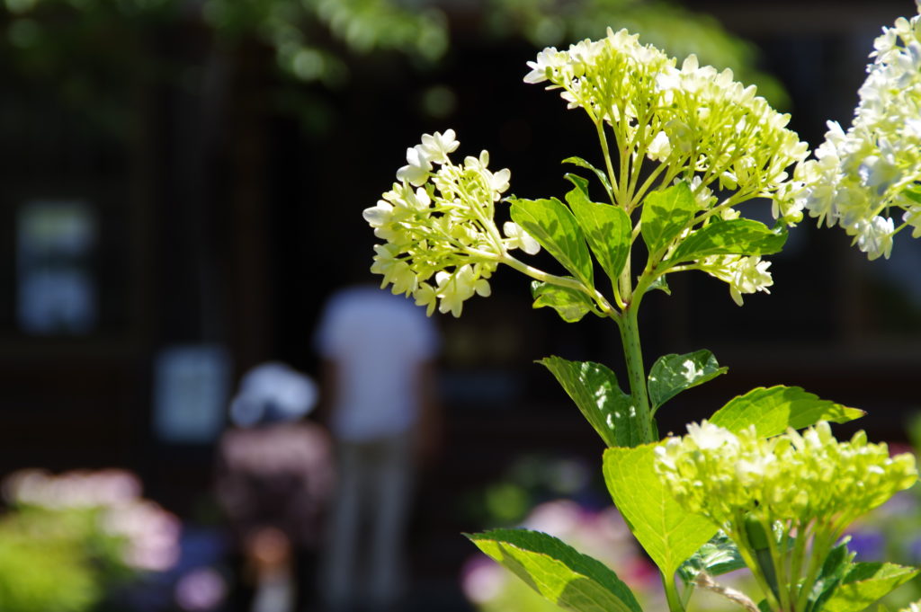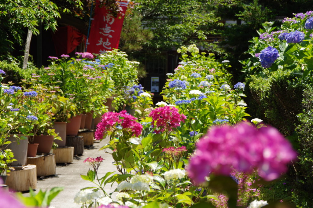 境内正面はまるで花畑のよう。お寺と紫陽花が融合し、梅雨時期の参拝を楽しませてくれます。