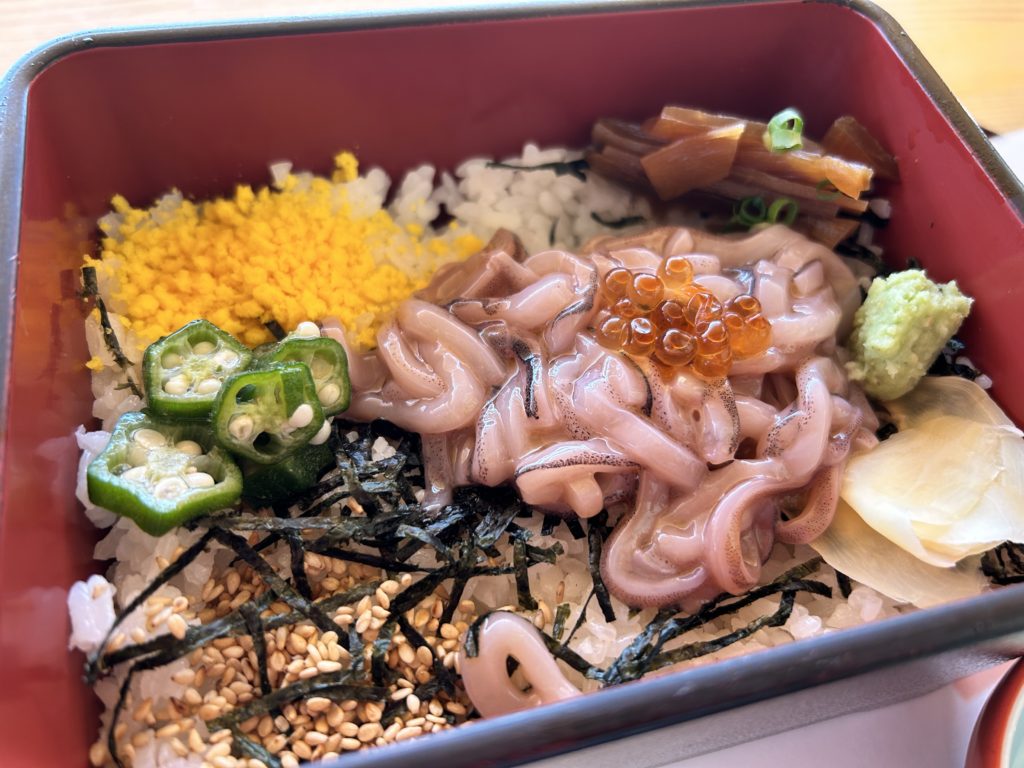 こちらはその中の一つ、能登小木港名物のスルメイカを使った「味付き船凍イカ丼」です。