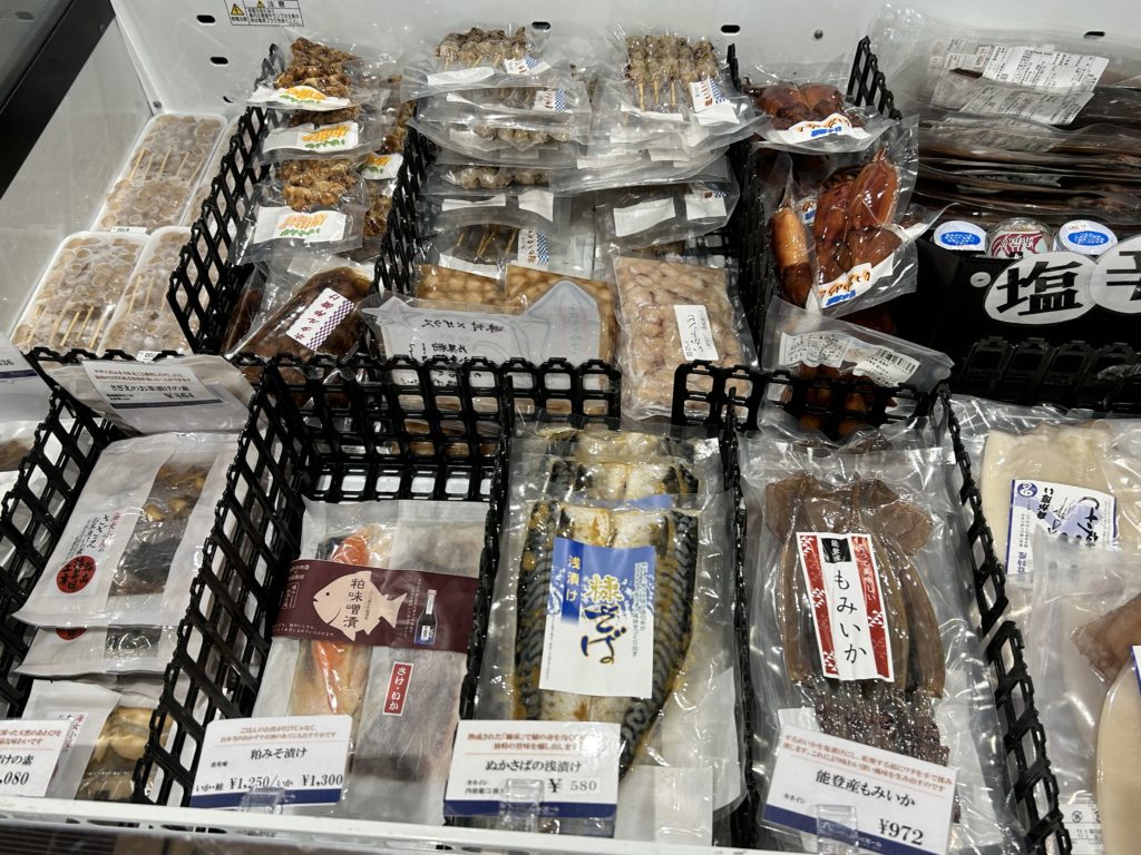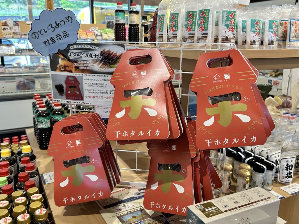 イカの駅つくモール内に入ると名物船凍イカをはじめ、イカを使った加工品、さらに能登の伝統的な調味料いしるなどバリエーション豊富なお土産や名物が並びます。